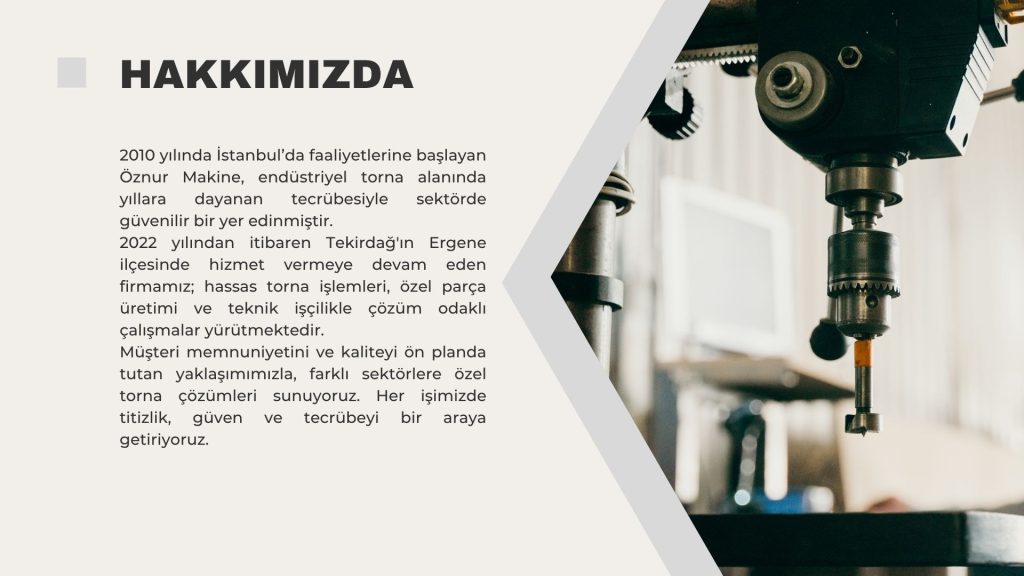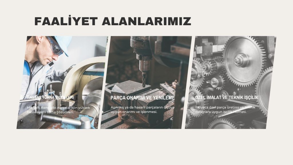 10 yılı aşkın sektör tecrübemizle, özel ölçü torna işleri, parça yenileme ve mekanik montaj çözümleri sunuyoruz.